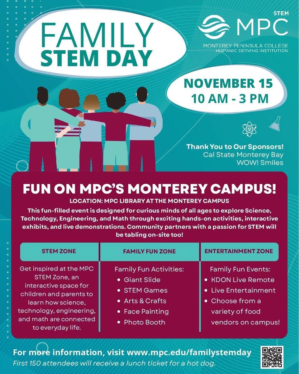 There will be an exciting STEM Family Day at the Monterey Peninsula College this Saturday, and Alisal students who attend will get credits for Saturday Academy. The STEM Day will be held Saturday, November 15, 2025, from 10 a.m. to 3 p.m.