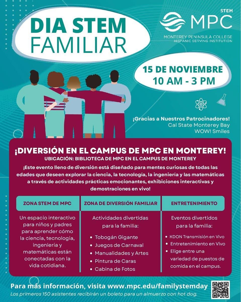 Este sábado, el Monterey Peninsula College celebrará un emocionante Día Familiar de Ciencia, Tecnología, Ingeniería y Matemáticas (STEM), y los estudiantes de Alisal que participen recibirán créditos para la Academia Sabatina. El Día STEM tendrá lugar el sábado 15 de noviembre de 2025, de 10:00 a 15:00.